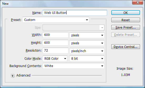 第1步:創(chuàng)立Photoshop文檔 該按鈕大。▽抶長(zhǎng))170像素x50像素。我們的畫(huà)布大一點(diǎn),比如設(shè)為600像素x600像素