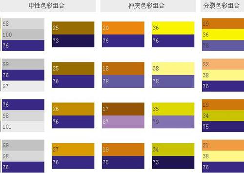 純藍和一些紅色結合在一起會發(fā)生藍紫色的感覺,這是色相環(huán)上最深的顏色。這類顏色調(diào)配可象征權威,表現(xiàn)出皇家的氣度,就象夏日的梅子,有莫測高深的藍黑,藍紫和它的補色——黃橙調(diào)配起來,