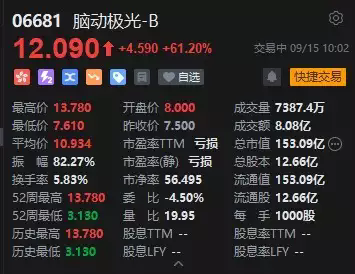 港股腦動極光-B在2025年9月15日的交易中表現非常驚人,一度拉升大漲超80%,報13.78港元,為接連第三日上漲,股價創(chuàng)上市新高,