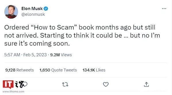 馬斯克發(fā)今日推文稱:“在幾個(gè)月前訂購(gòu)了一本叫做《怎么欺詐》的書,但還沒到,開始覺得它可能是... 不,我相信它很快就會(huì)到了。”