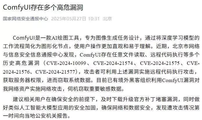 5 月 27 日消息,國(guó)家網(wǎng)絡(luò)安全通報(bào)中心今日發(fā)文,稱 AI 繪圖工具 ComfyUI 存在多個(gè)高危漏洞。體現(xiàn)了國(guó)家對(duì)網(wǎng)絡(luò)安全風(fēng)險(xiǎn)的高度重視。ComfyUI作為一款基于節(jié)點(diǎn)式工作流的開(kāi)源Stable Diffusion工具,