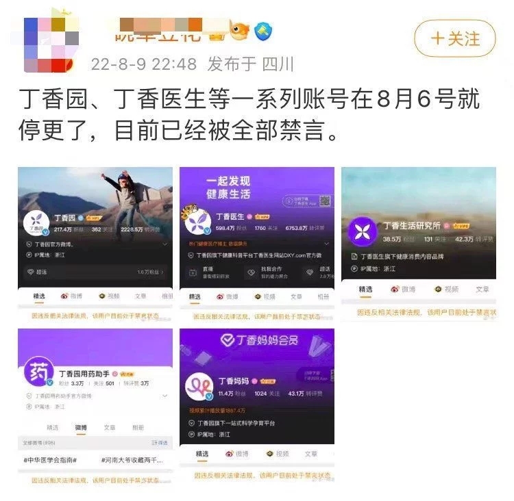 8月10日音訊,針對丁香園旗下系列微博賬號被禁言一事,據(jù)齊魯壹點報導,丁香園工作人員回應稱,公司部分社交媒體賬號因平臺要求,