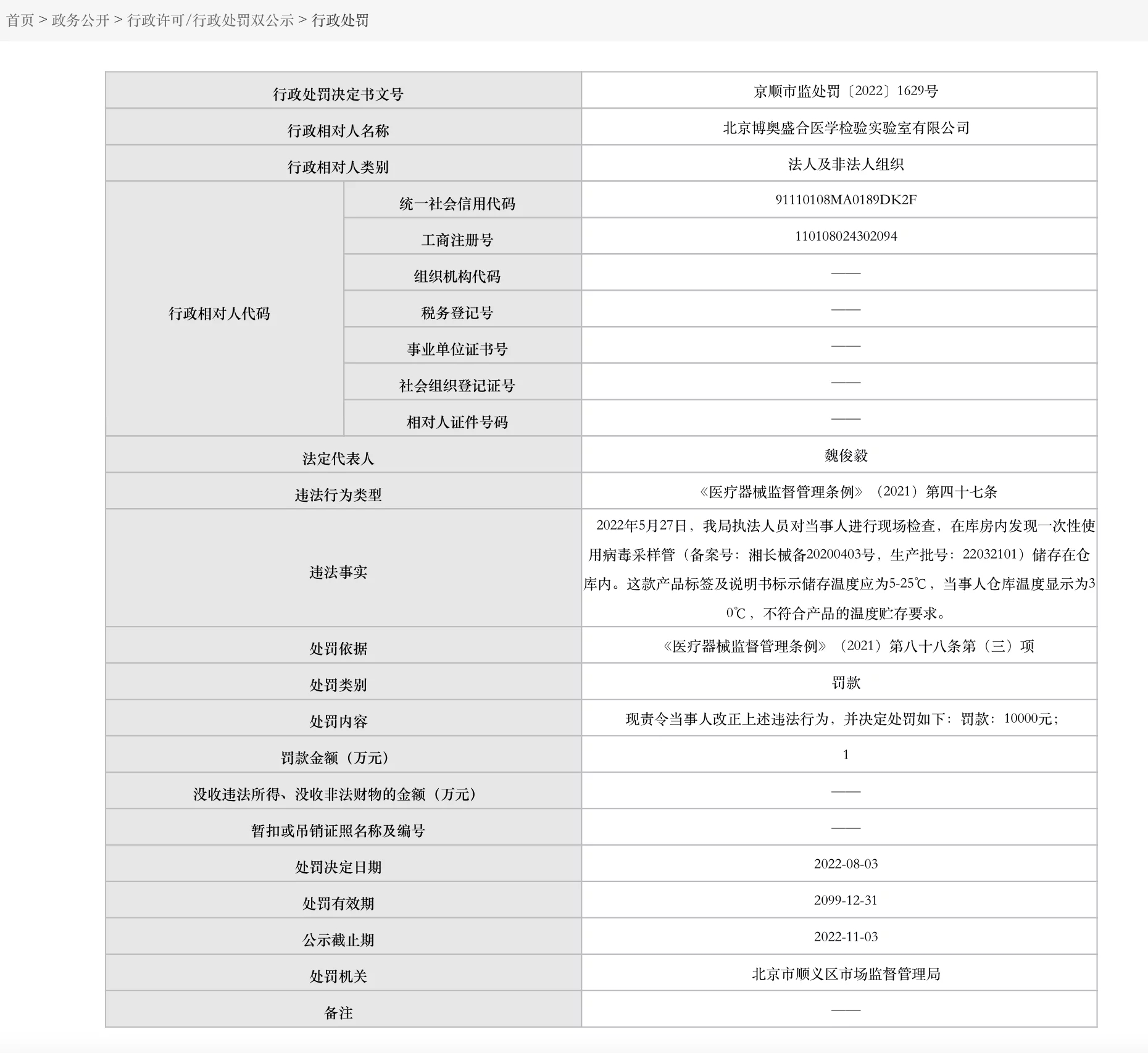 據(jù)北京市監(jiān)局網(wǎng)站音訊,2022年5月27日,北京市順義區(qū)商場監(jiān)督管理局執(zhí)法人員對北京博奧盛合醫(yī)學查驗實驗室有限公司進行現(xiàn)場查看,