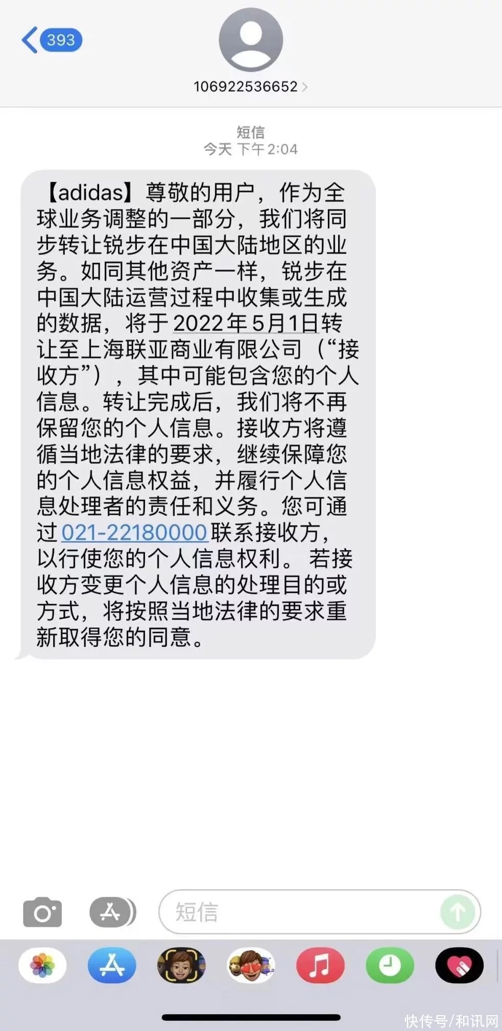 4月18日,多位顧客表明收到阿迪達斯的短信,被奉告其個人信息將與銳步事務(wù)同步轉(zhuǎn)讓給上海聯(lián)亞商業(yè)有限公司。 短信稱,