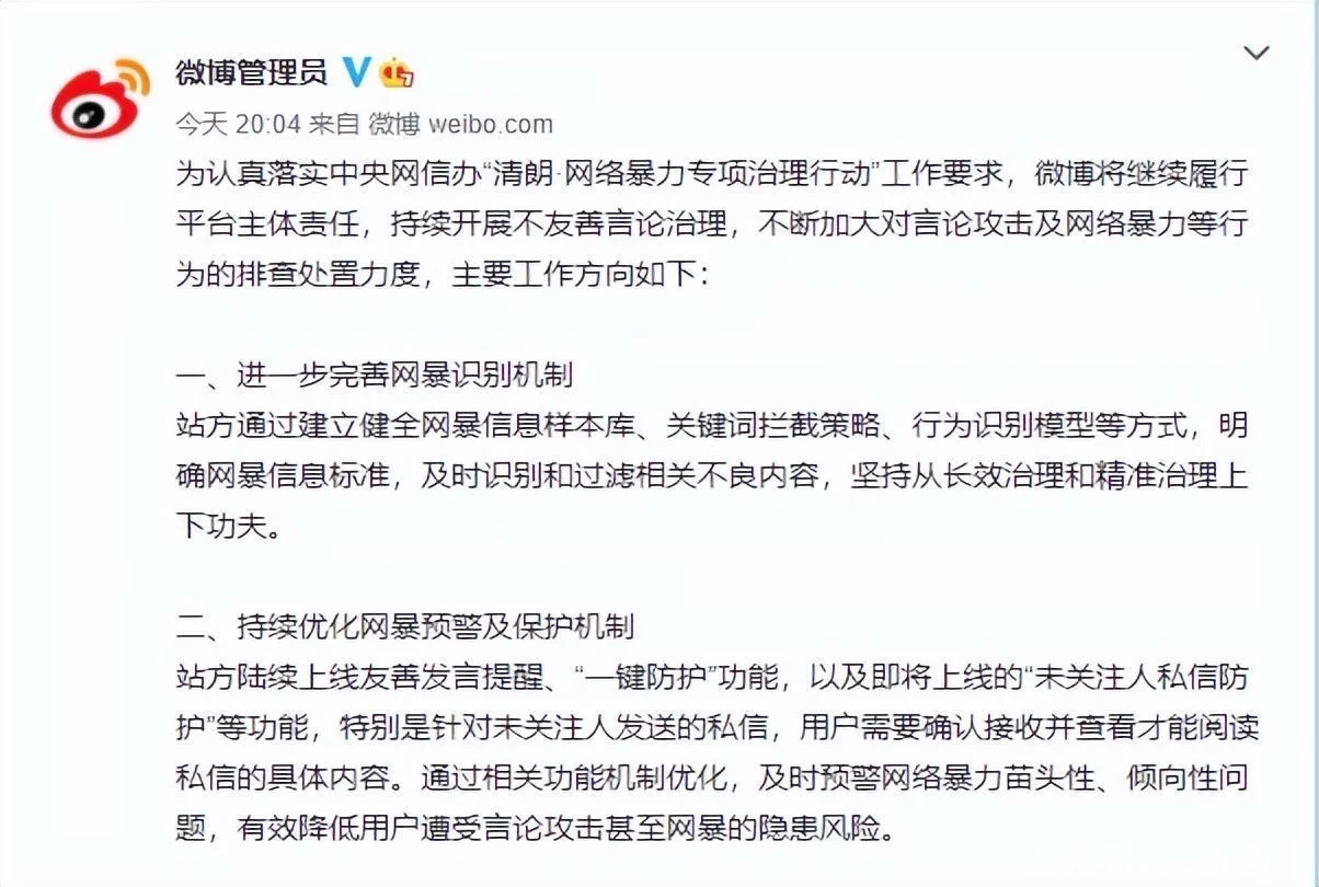 微博管理員發(fā)文稱,為認真落實中央網(wǎng)信辦“明亮清明·網(wǎng)絡(luò)暴力專項管理行動”作業(yè)要求,微博將繼續(xù)履行渠道主體職責(zé),持續(xù)展開不友善言辭管理,