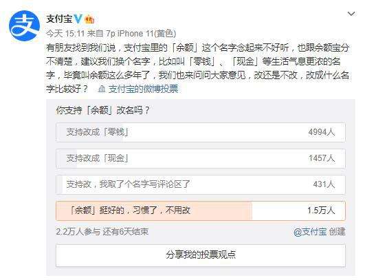 7月16日音訊,@支付寶 官方微博發(fā)布音訊稱(chēng),因部分用戶(hù)反映“余額”功用的姓名念起來(lái)不好聽(tīng),因此有了改名的計(jì)劃。但在支付寶建議的改名投票中,